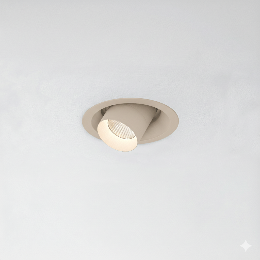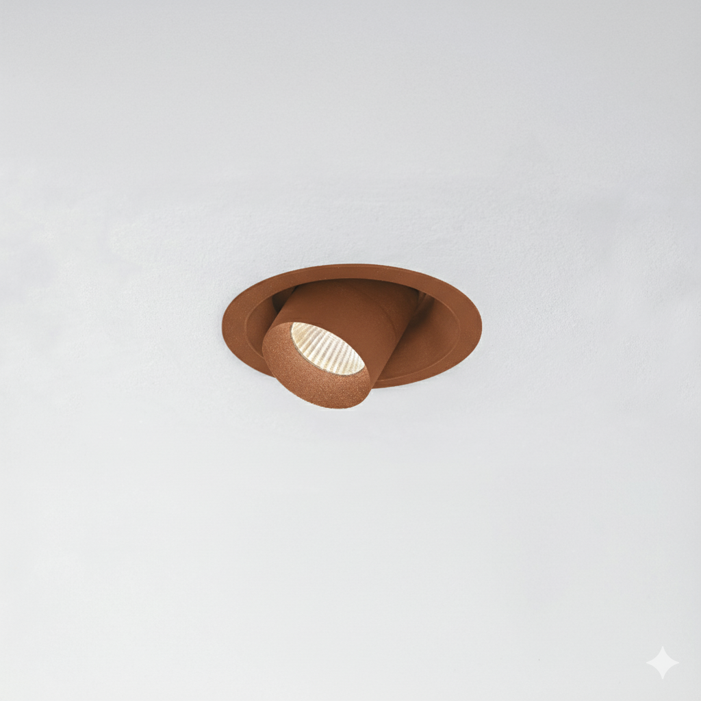 Round recessed direct light mainly made of aluminium. Symmetrical light with 20°,25°,40°,43°,60° of beam angle. COB LUMINUS fully powered by 10,3W offers CRI90 2700K, CRI90 3000K, CRI90 4000K providing 683Lm, 779Lm, 870Lm respectively, with an efficiency of 67Lm/W, 76Lm/W, 85Lm/W respectively. Available in IP20 protection. Dimming options available are ON-OFF, PH-CUT, 1-10V, PUSH ONLY, DALI-2. Options Honeycomb filter, Frosted glass, and finishes available in black-textured-matt, white-textured-matt, oliva-textured-matt, mocha-textured-matt, terracota-textured-matt, ocre-textured-matt, dark-bronze, brushed-copper, old-silver, custom-finish, sand-textured-matt, light-bronze, median-bronze, Gun Metal.